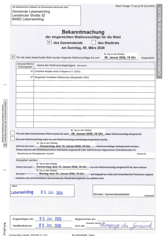 Bekanntmachung der eingereichten Wahlvorschläge für die Wahl des Gemeinderats am 08.03.2026